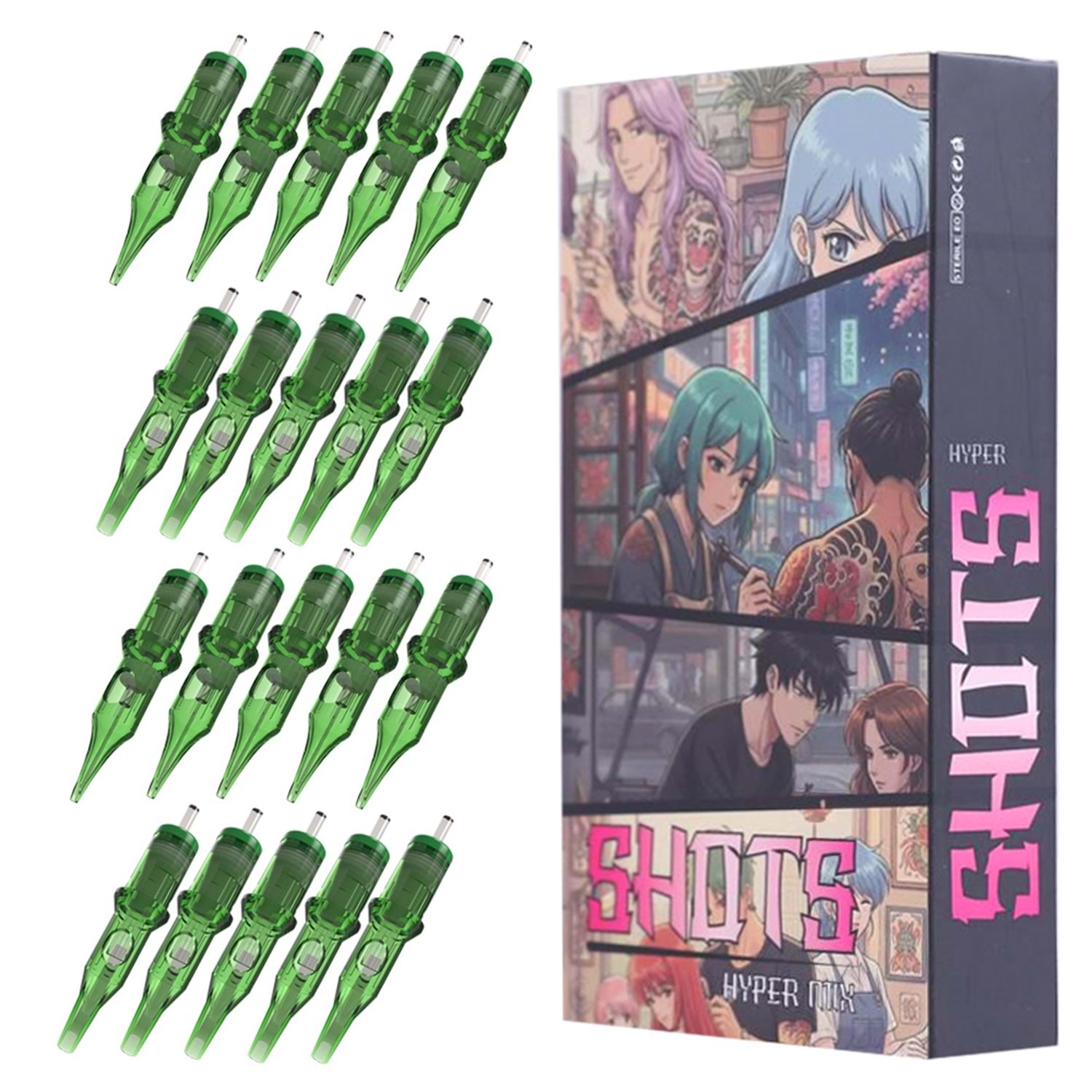 BİR KUTUDA 20 ADET KARIŞIK SHOTS HYPER KARTUŞ DÖVME İĞNESİ VARDIR KUTU İÇERİĞİ: 1005RL, 5 ADET 1003RL, 5 ADET 1009RS, 5 ADET 1015RM, 5 ADET